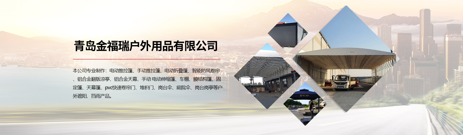 青島金福瑞戶外用品有限公司是一家專業從事生產、研發、銷售為一體的主營推拉篷、電動推拉篷、大型雨棚、戶外倉儲雨棚、智能防風卷簾、智能涼亭、快速門、戶外遮陽擋雨產品的公司,我司創立于2011年,位于美麗的海邊城市——青島。本公司專業制作:推拉篷、電動推拉篷、大型雨棚、戶外倉儲雨棚、電動折疊篷、智能防風卷簾、鋁合金翻版涼亭、pvc快速門、堆積門、膜結構篷、車棚、曲臂篷、固定篷、崗臺傘、庭院傘等戶外遮陽、擋雨產品以及各種崗臺、崗亭。我們注重產品的質量與服務,為廣大客戶的需求提供完善的解決方案??筛鶕男枨鬄槟可矶ㄗ?,以經濟實用、自然、唯美、時尚為追求,全心全意為熱愛生活、熱海事業的您尋找不一樣的感觸與享受。...
